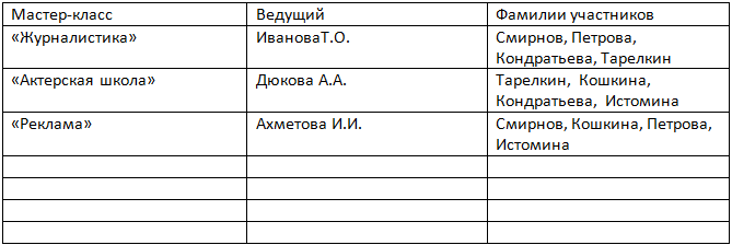 Списки участников мастер-классов (заполняет координационная группа, составляется на основе всех регистрационных листов) – пример заполнения: