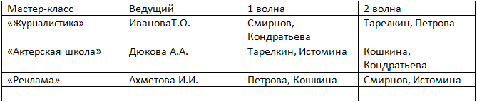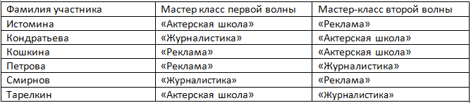 Шаг 4. Обобщить собранную информацию. Составить списки участников мастер-классов с таким расчетом, чтобы каждый ученик попал на желаемые мастер-классы, а численность участников каждого мастер-класса была примерно поровну поделена между первой и второй «волной» (выполняет координационная группа).