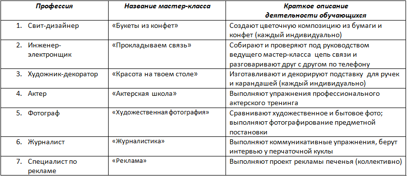 Список мастер-классов, реализованных в опыте апробации «Города мастеров» в ГБОУ школе 207 Центрального района Санкт-Петербурга: