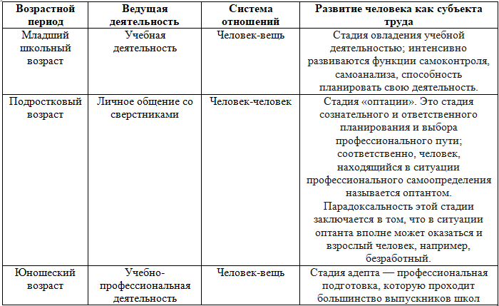 Приведенные данные со всей очевидностью говорят о том, что на каждой стадии развития человека как субъекта труда перед ним стоят особые задачи, требующие специфической деятельности для их решения. И работа по развитию профессионального самоопределения для каждого этапа должна строиться особым образом.