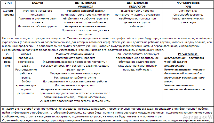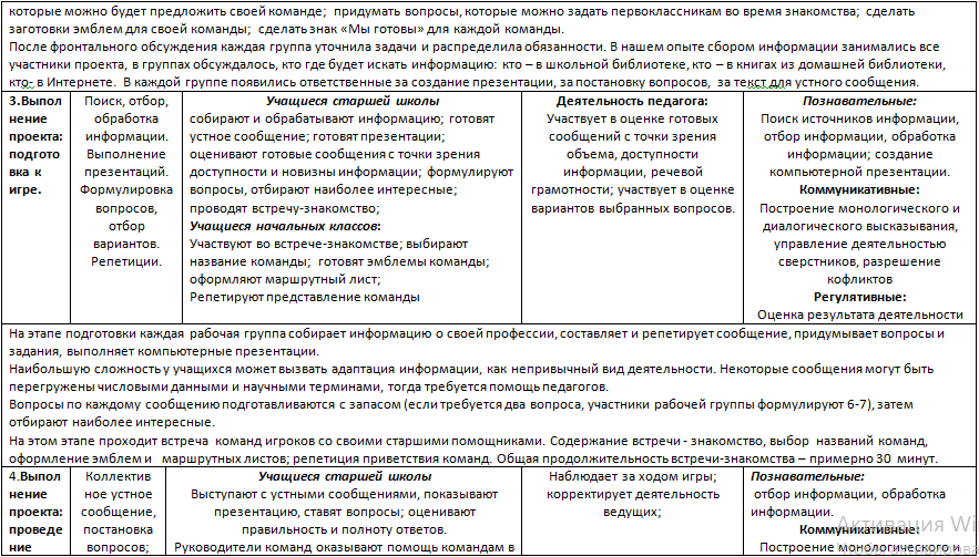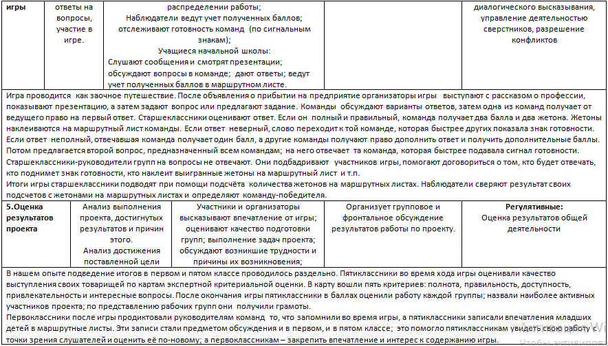 У учащихся старшей школы: совместное планирование работы по проекту; распределение обязанностей; управление деятельностью младших товарищей; управление деятельностью сверстников в группе; координация деятельности при подготовке к коллективному выступлению; построение монологического высказывания.